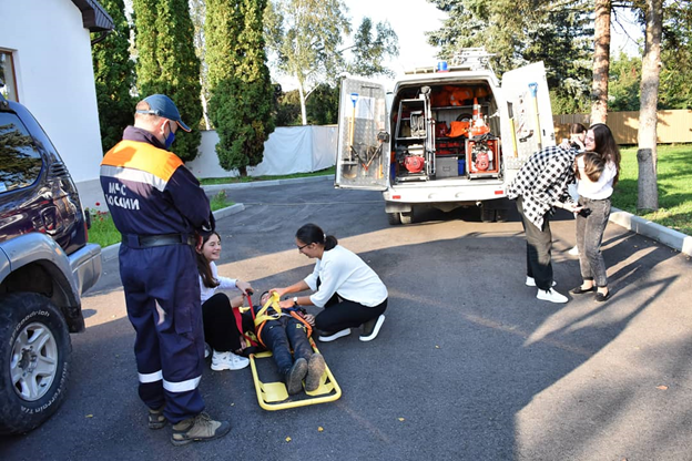 Далее спасатель Мазан Киштыков рассказал о правилах оказания первой помощи при ДТП, их отличии от оказания помощи в других экстренных ситуациях, после чего ребята в игровой форме отработали инсценировку автоаварии и свое поведение при этом, разделившись на условно пострадавших, тех кто оказывают первую помощь, транспортировку, взаимодействие с экстренными службами. Также спасатель продемонстрировал оборудование, которое используется во время проведения спасательных работ при ДТП для деблокировки пострадавших и их транспортировки.