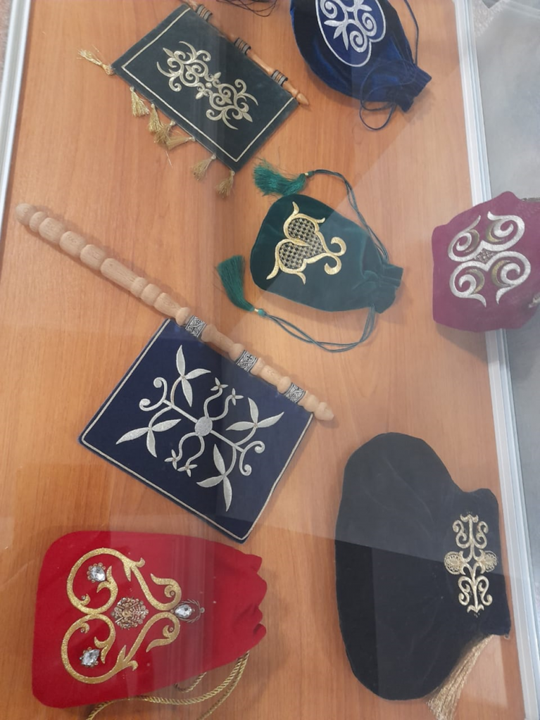 Стенды с золотым шитьём и киизами очаровывают и приковывают к себе сразу всё внимание, особенно женское.