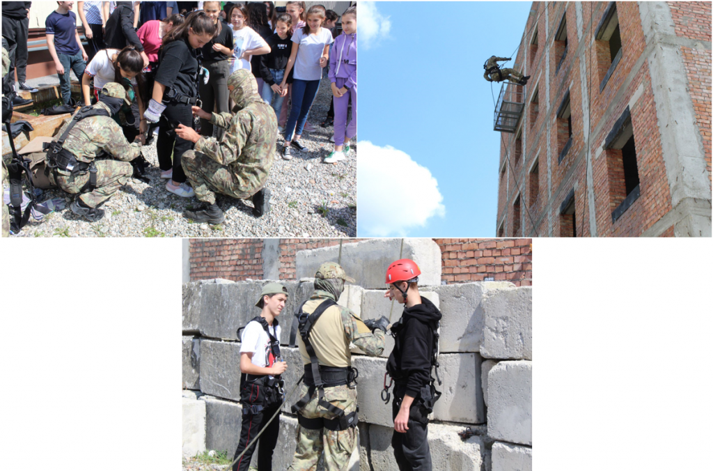 Экскурсия продолжилась выставкой оружия из арсенала подразделения. В завершение встречи бойцы отряда, предварительно проведя инструктаж по технике безопасности, помогли ребятам освоить навыки упражнений по спуску с четырехэтажного здания с помощью веревки и подъема на скалодроме.