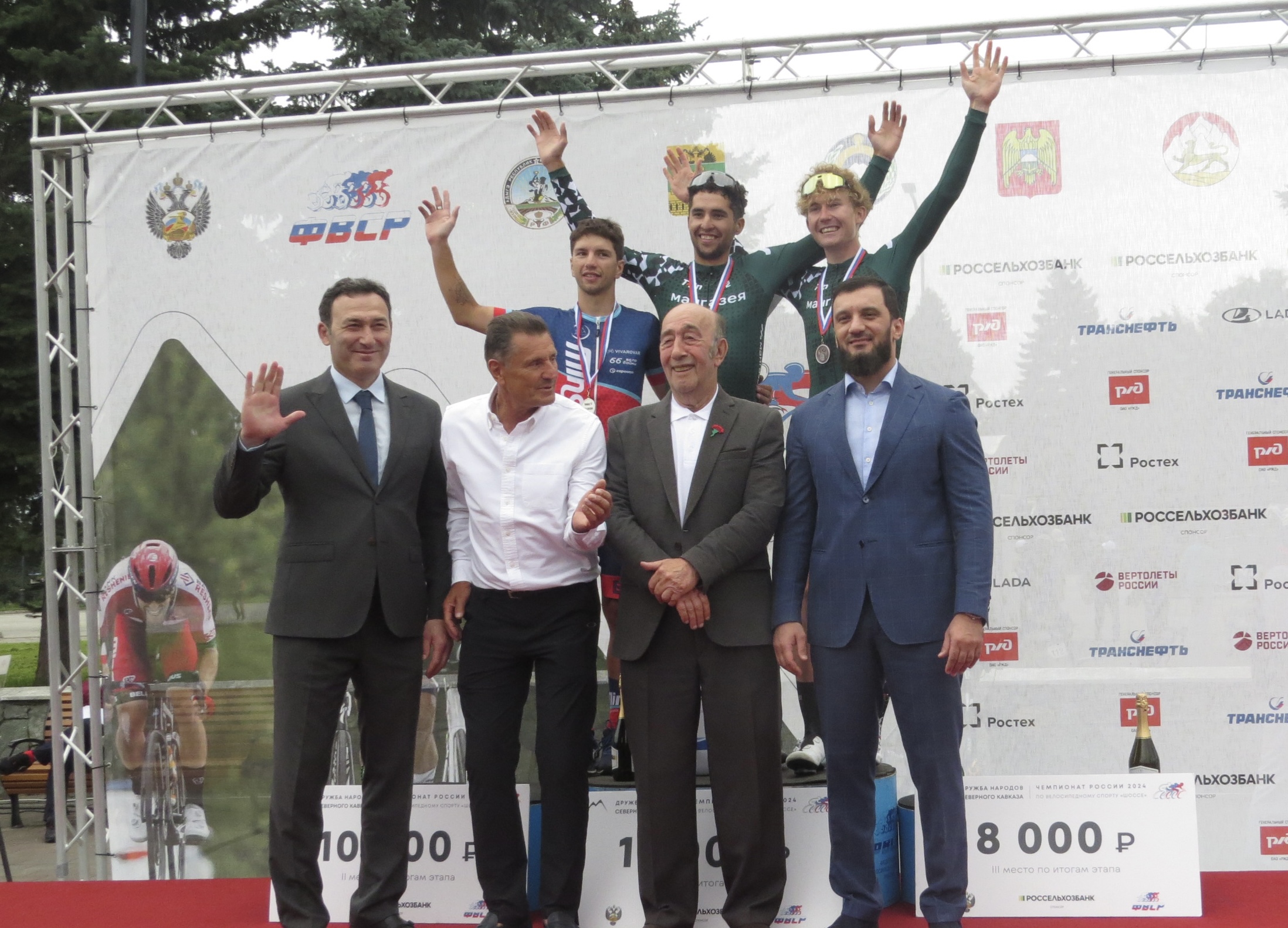Сначала были награждены победители вчерашнего 7-го этапа, который стартовал на площади Абхазии, а закончился в Приэльбрусье, в альплагере «Шхельда», затем – сегодняшние победители и призеры.