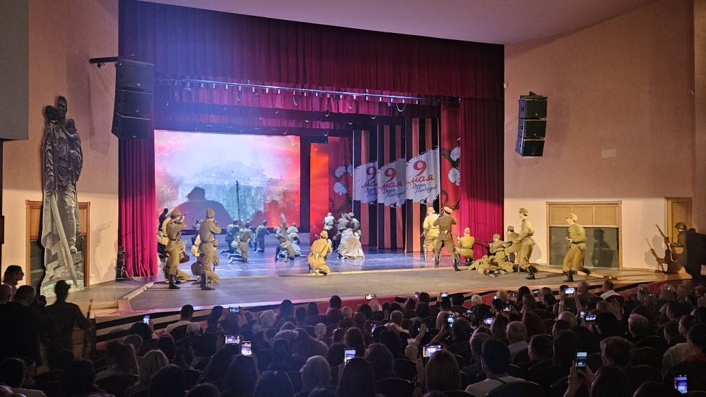 Песня «Первым делом самолёты» в исполнении Амура Текуева и хора Музыкального театра наполнила зал энергией и оптимизмом. Мощные голоса исполнителей, словно взмывающие ввысь, воодушевляли и вселяли уверенность в грядущей победе.