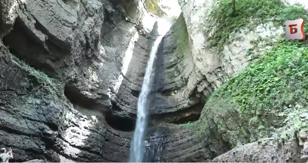 В кадре демонстрируются впечатляющие, красочные виды Чегемских водопадов.