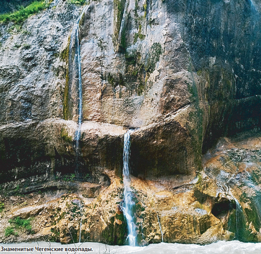 Следующим пунктом в экскурсии стали Чегемские водопады, описание которых журналист начал с легенды о черкешенках, которые сбросились со скалы, чтобы не стать пленницами чужеземцев, а их длинные косы, цепляясь за уступы, превращались в струи воды.