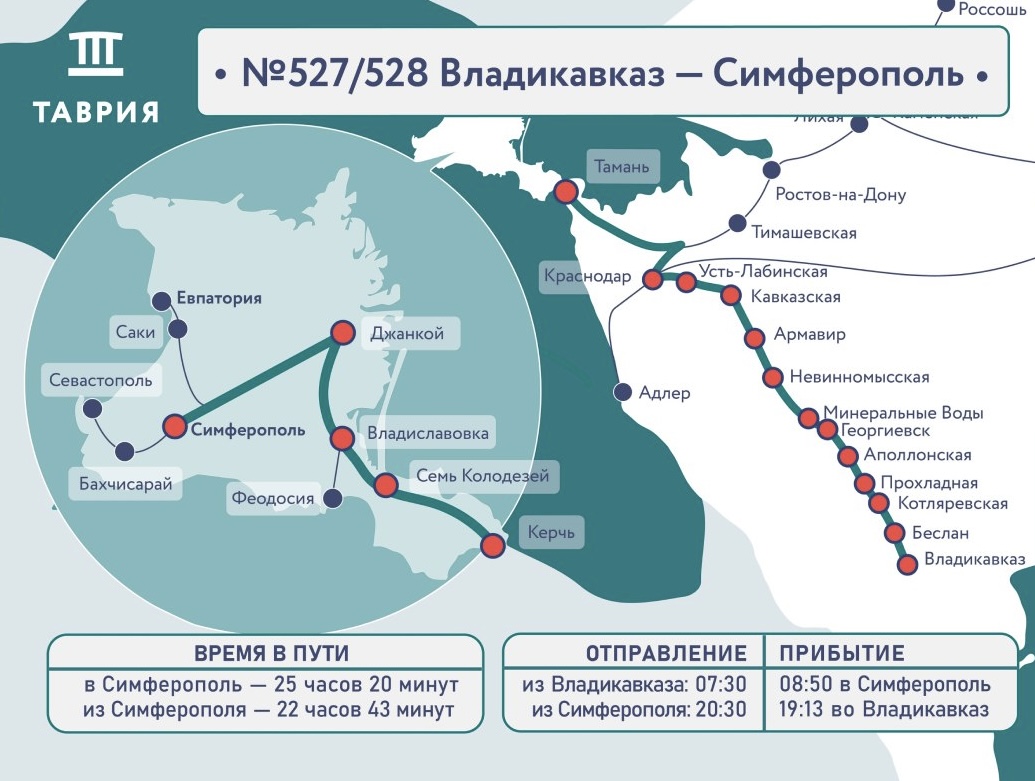Поезд свяжет Республику Крым с двумя регионами — Северной Осетией и Кабардино-Балкарией, куда ранее маршруты поездов «Таврия» не пролегали, сообщает пресс-служба Минкурортов КБР.